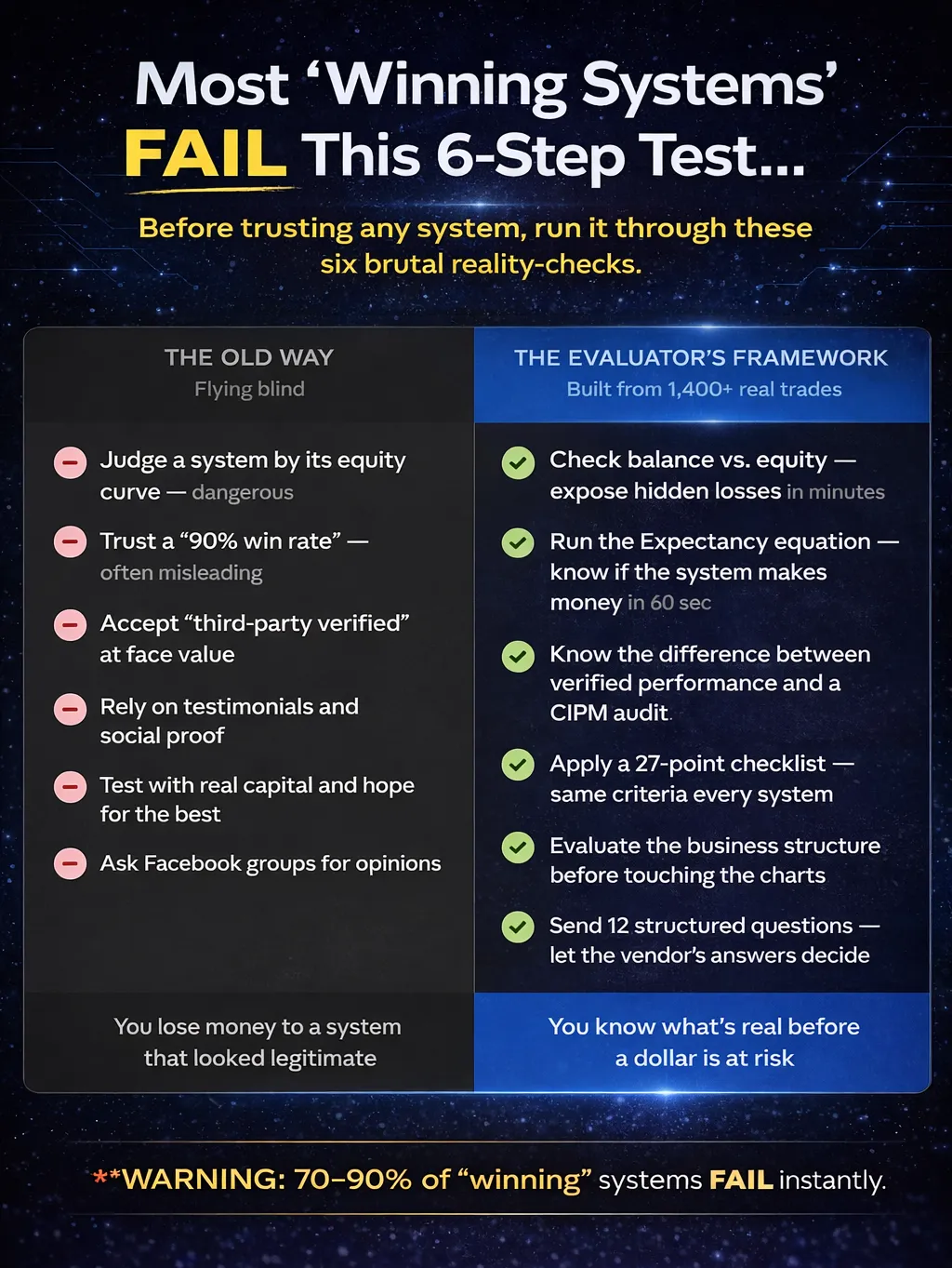 A six-step evaluation system that teaches you how to assess any automated trading system using the same structural criteria used by institutional allocators and professional quantitative researchers. It doesn't teach you to trade. It doesn't teach you to code. It doesn't teach you to build a system. It teaches you to see what a system is actually made of underneath its marketing — and to know, before you commit a dollar, whether it's structurally sound or carrying risk that hasn't activated yet.