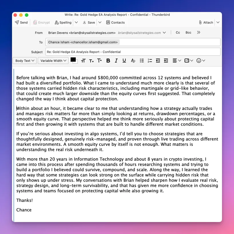 ❌ We don't focus on testimonials — because Chance's system had real testimonials from real people making real money. Every one of them lost their accounts on the same day. The testimonials weren't fake. The risk was invisible. There's a specific reason that's possible — and it keeps happening.